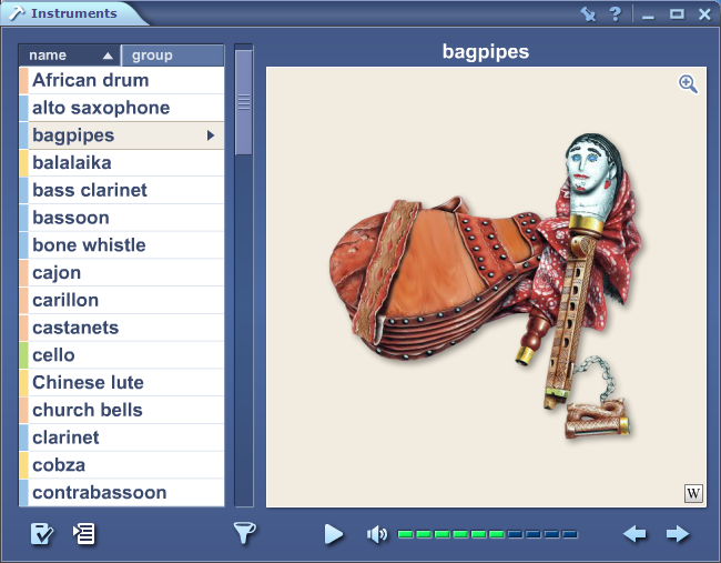 You can sort any instrument by clicking on its name, the image can be zoomed in on for further details and you can listen to its sound by clicking on the play button under the image. If you want to learn more about the instrument just click on the “W” in the right bottom corner of the image to open the relevant Wikipedia article.