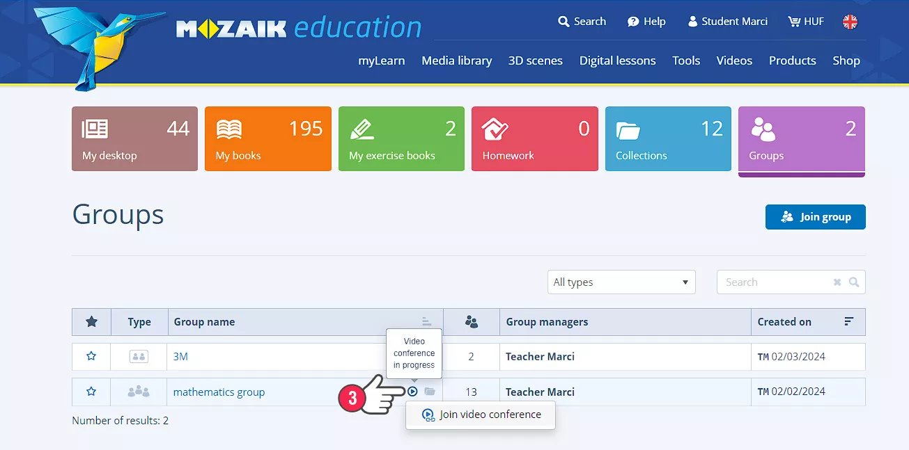 Để bắt đầu hội nghị video, trên trang hội nghị video (1), hãy nhấn vào nút hội nghị video (2) trong hàng của nhóm đã cho, sau đó chọn nền tảng bạn muốn sử dụng (Google Meet, Zoom).
