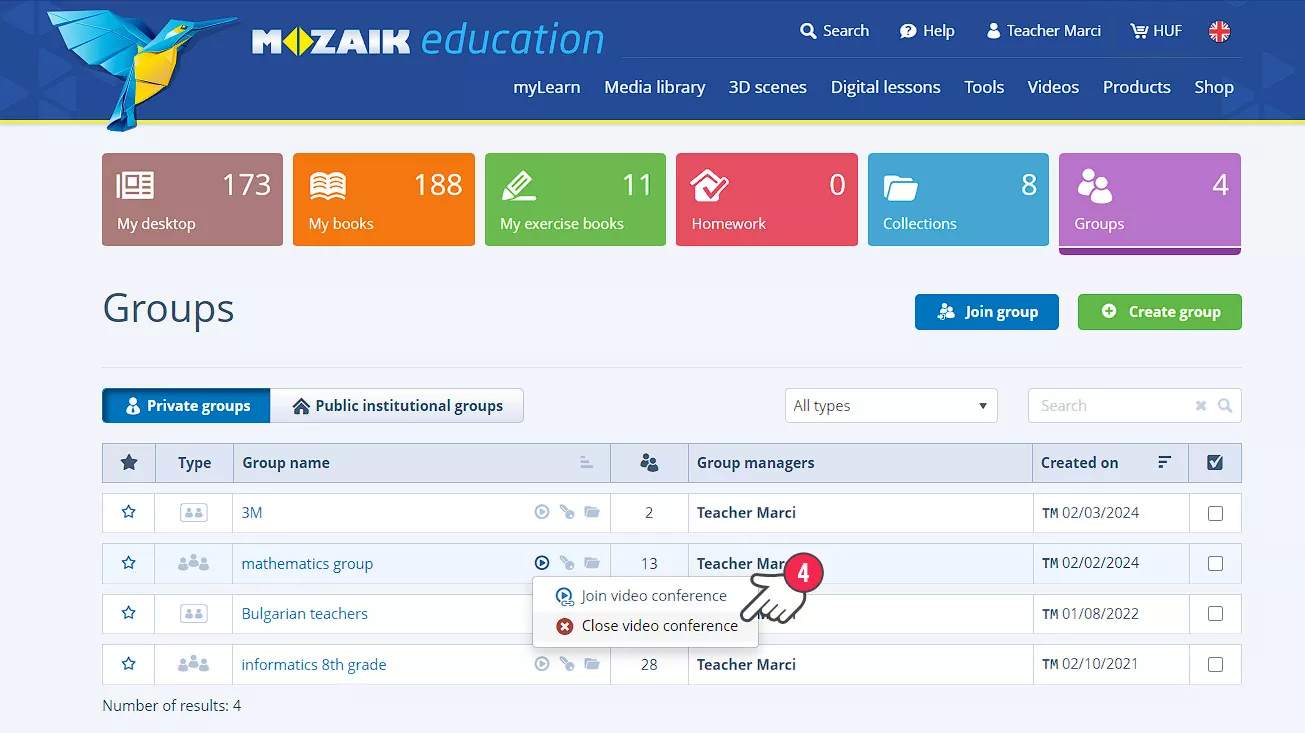 Hội nghị video vẫn hoạt động trong một thời gian ngay cả sau khi đăng xuất và bằng cách nhấn vào nút tham gia, bạn vẫn có thể tham gia cuộc gọi. Bằng cách nhấn vào nút kết thúc hội nghị video (4), giáo viên có thể kết thúc cuộc gọi.
