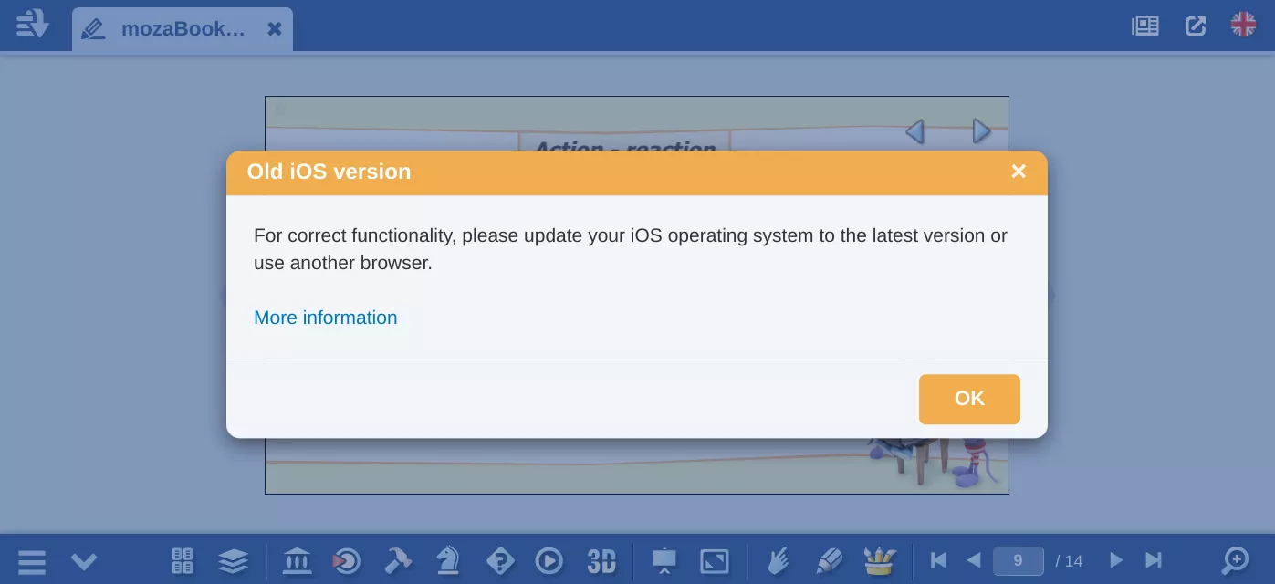 Lỗi này xuất hiện trong các hệ điều hành cũ hơn iOS 17 và chỉ có trong trình duyệt Safari. Để tránh lỗi này, hãy cập nhật hệ điều hành của bạn hoặc sử dụng mozaWeb trong trình duyệt khác (Chrome, Firefox, Edge, Opera...).