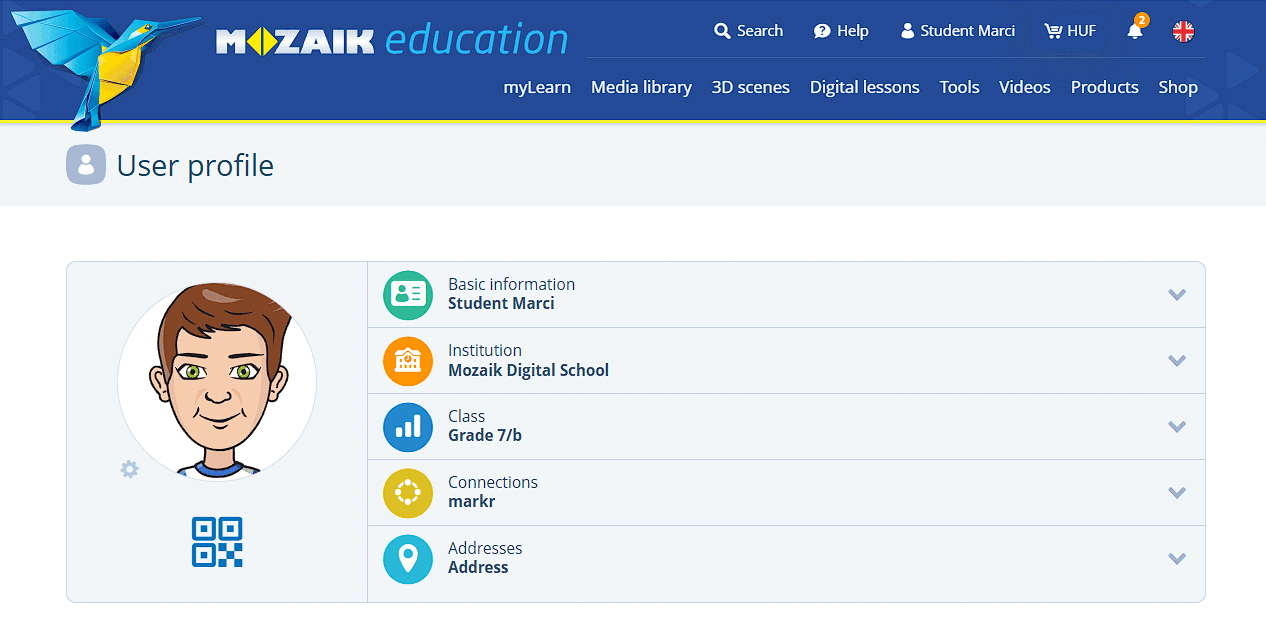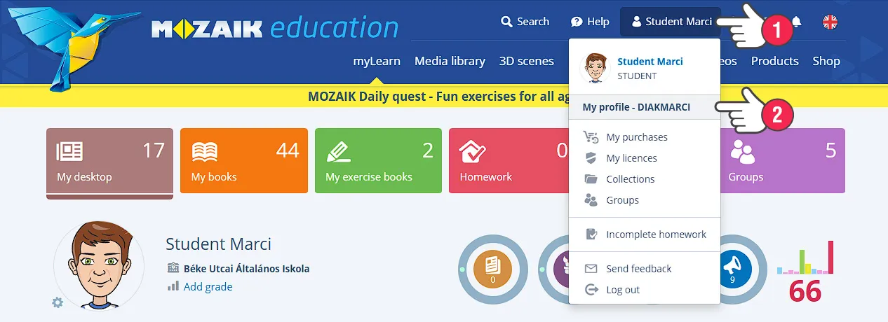 Once you have logged in to mozaWeb, click on your name (1) and select My profile (2) in the drop-down menu: