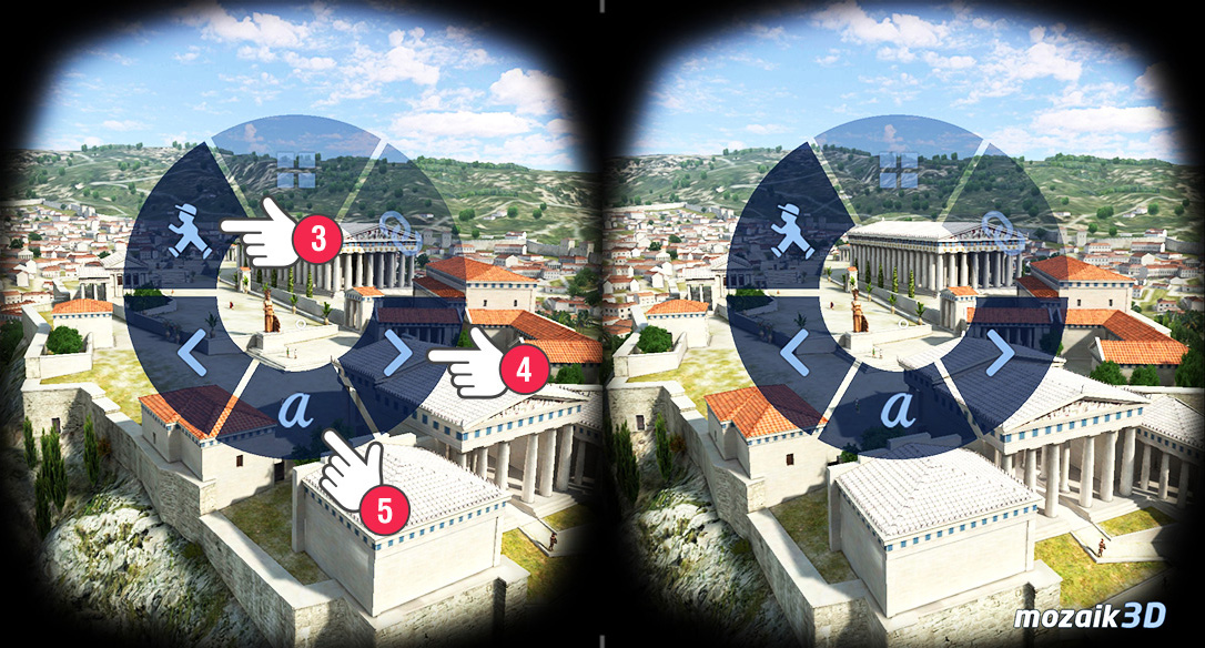 Bạn có thể xem xung quanh trong cảnh 3D bằng cách di chuyển đầu. Nếu bạn nghiêng đầu sang trái hoặc phải, menu sẽ bật lên và bạn có thể chuyển sang chế độ đi bộ (3), chọn giữa các chế độ xem cài đặt sẵn (4) hoặc bật và tắt nhãn (5). Để chọn một mục menu, hãy xoay đầu sao cho con trỏ trỏ vào biểu tượng bên phải.