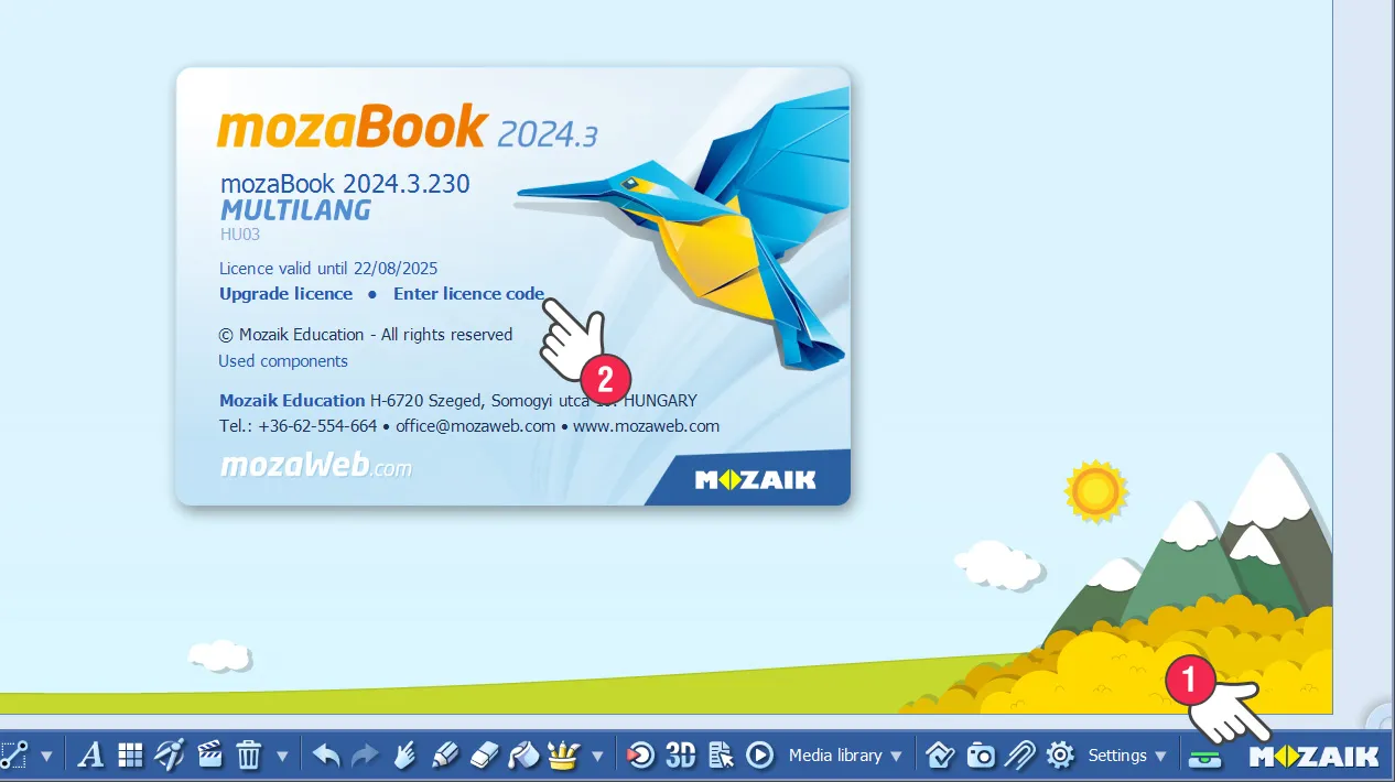 Sau khi đăng nhập vào mozaBook, nhấn vào logo Mozaik (1) trên thanh công cụ. Chọn tùy chọn Nhập mã giấy phép (2) trong hộp thông tin xuất hiện.