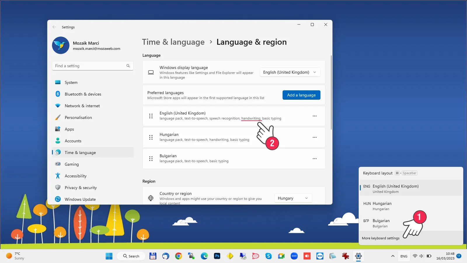 • Click on the language settings on the right side of the tray and choose More keyboard settings. (1) (Or Settings => Time and language => Language and region)