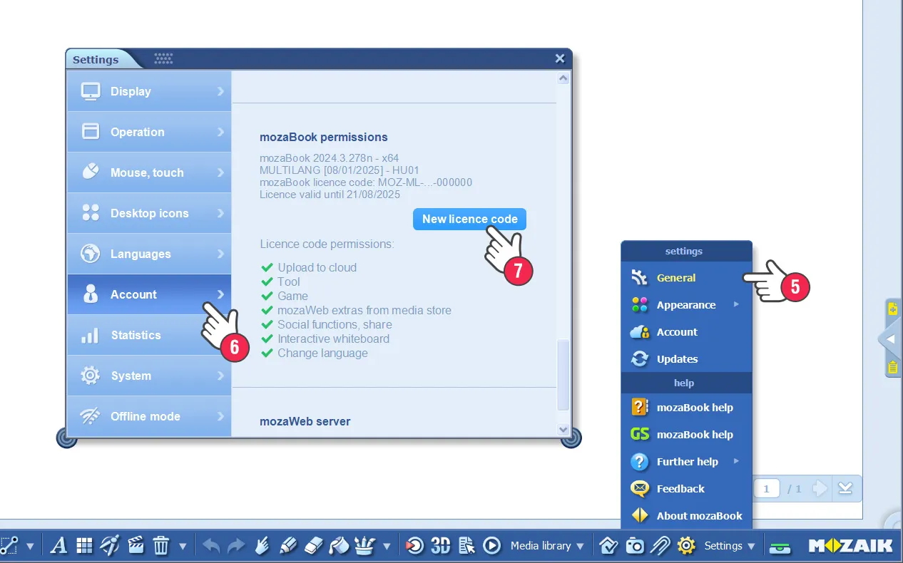 To do so, choose 'General' in the settings menu (5), select 'mozaBook login' (6) in the settings panel and click on 'New licence code' (7). After you restart the software, mozaBook will ask you to enter the licence code.