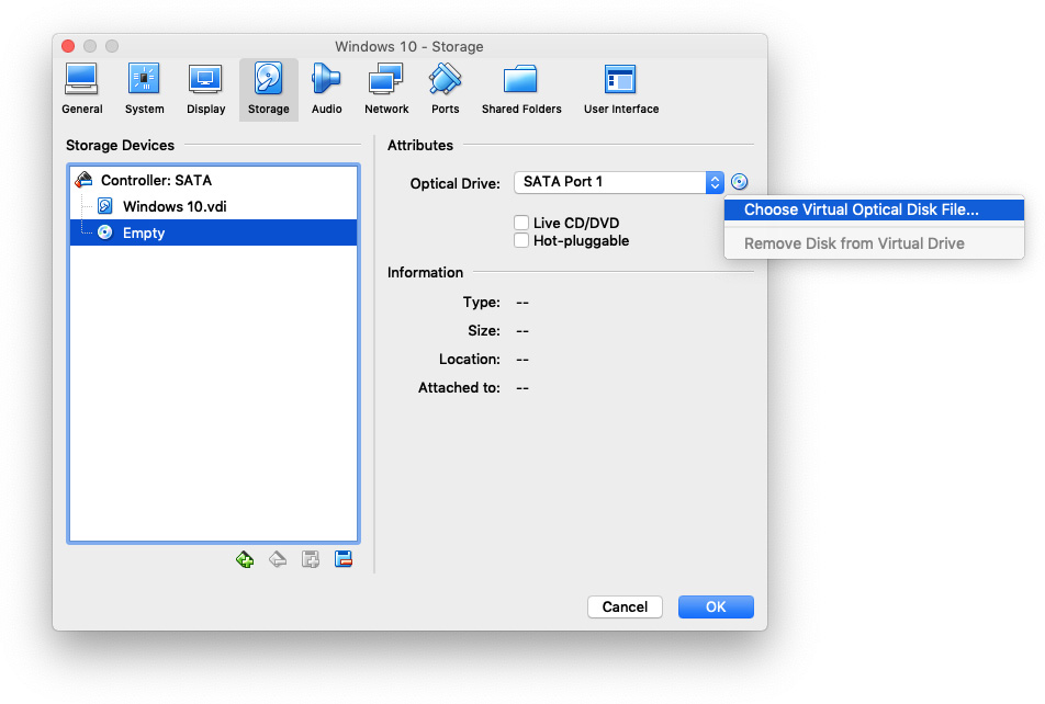 Once the virtual machine has been created, click on the Settings button to access the settings of the virtual machine. Then click on the 'Storage' menu and select the 'Empty' CD drive. Then click on the CD icon on the right side of the screen to find the Windows 10 installer you have previously downloaded from the Microsoft home page.