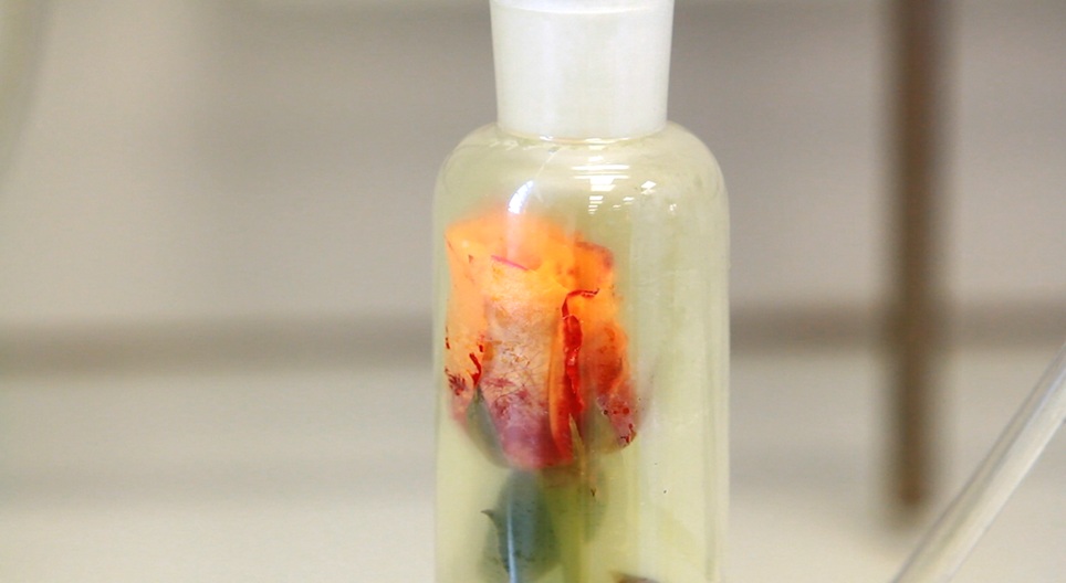 Trong thí nghiệm này, chúng tôi khử màu hoa hồng của chúng tôi bằng một ít khí clo.